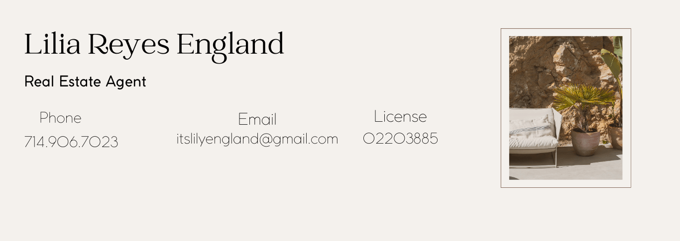 Hi, I’m Lilia England, an Orange County Realtor. I believe real estate is about more than buying or selling a home—it’s about people, timing, and the start of a new chapter. My goal is to help you move forward feeling supported, heard, and confident, while keeping the process as smooth and stress-free as possible.